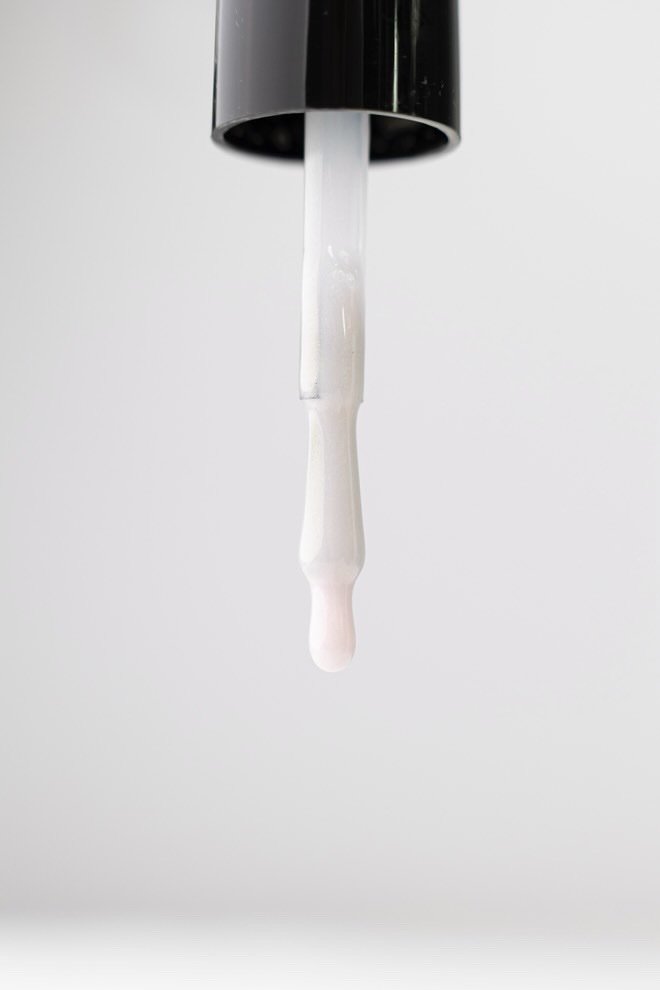 ✔️ Jei atsiranda nelygumų, prieš džiovinimą apverskite nagą kelioms sekundėms žemyn, kad gelis gražiai pasiskirstytų. Galite padėti sau plono teptuko pagalba.
